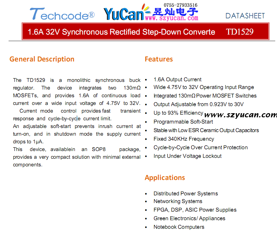 TD1529是一個(gè)同步整流降壓調(diào)節(jié)器。該設(shè)備集成了兩個(gè)低內(nèi)阻MOS,并提供1.6A的連續(xù)負(fù)載電流。具有4.75V至32V的寬輸入電壓。電流模式控制提供快速的瞬態(tài)響應(yīng)和逐周期的電流限制。一個(gè)可調(diào)的軟啟動(dòng)防止涌流,在關(guān)機(jī)模式下,電源電流下降到1uA。提供具有最小外部組件的非常緊湊的解決方案。采用SOP8封裝